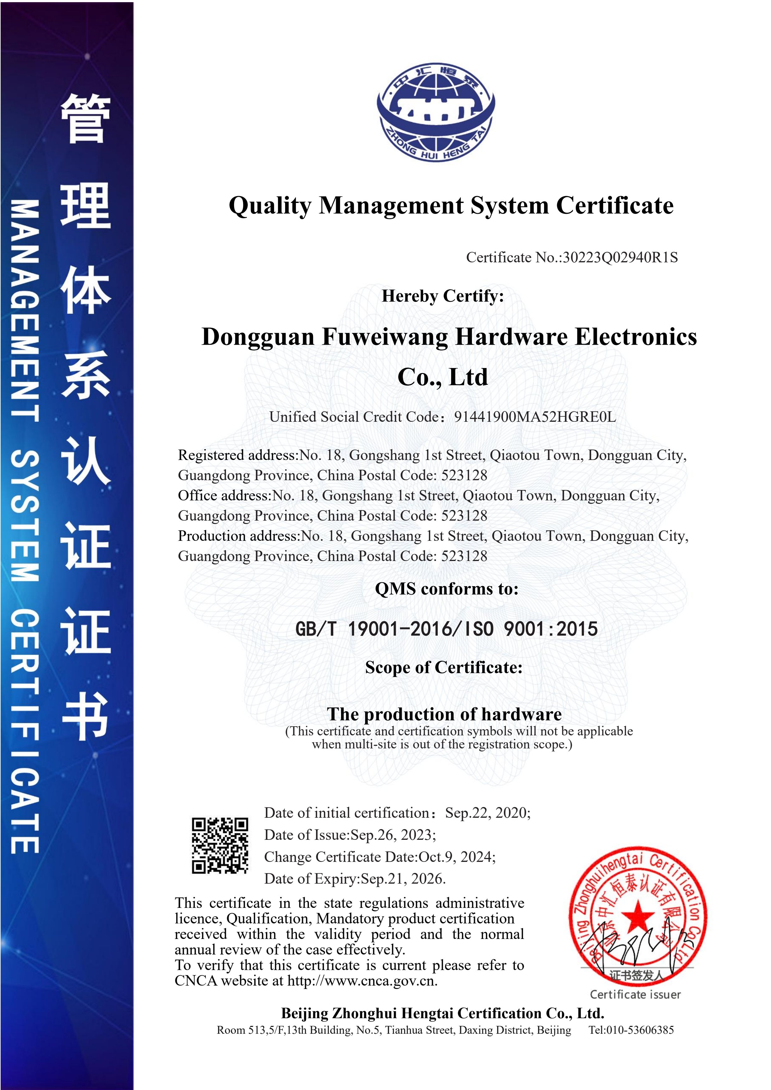 2018-11, Dongguan Fuweiwang Hardware & Electronics Co., Ltd. was set up, and the growing reputation brought the Company more and more business. More customers brought about more demand, and the Company began to develop business in the aviation, medical devices and semiconductor industries.